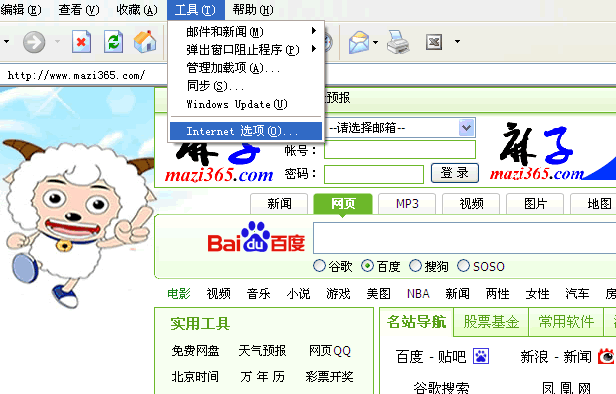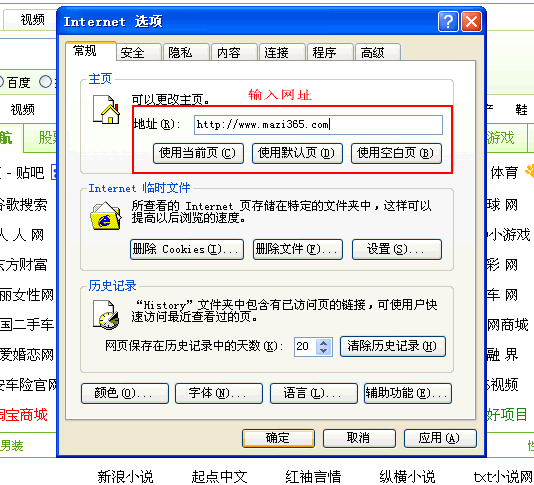 操作路径:打开ie浏览器 —> 工具 —> internet选项 —> 常规选项卡 —> 在“主页”下输入 www.mazi365.com 图文教程↓