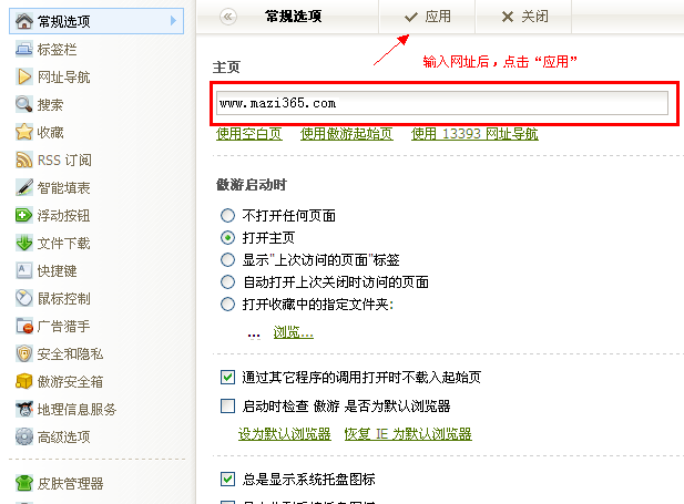 操作路径:工具 —> 傲游设置中心 —> 常规选项 —> 主页 —> 输入 www.mazi365.com 图文教程↓